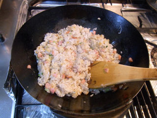 あとはご飯を入れて馴染ませながら炒め、ハムとネギを順番に入れます。