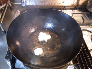 中華鍋を熱して油を戻した所にマヨネーズを投入。溶けてきたらショウガを少量加えます。